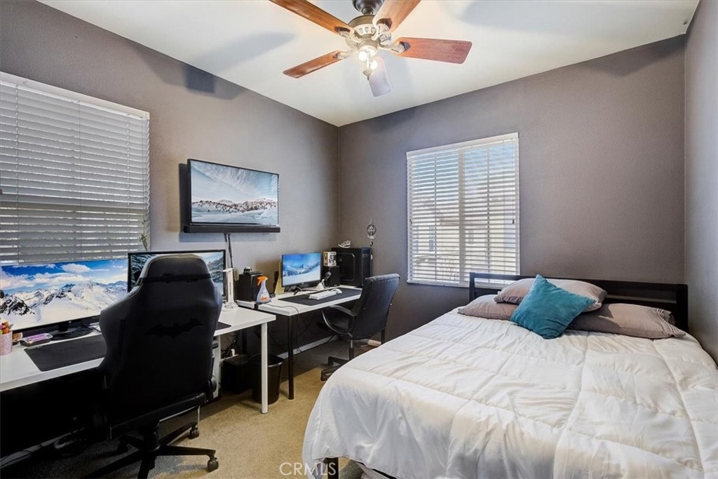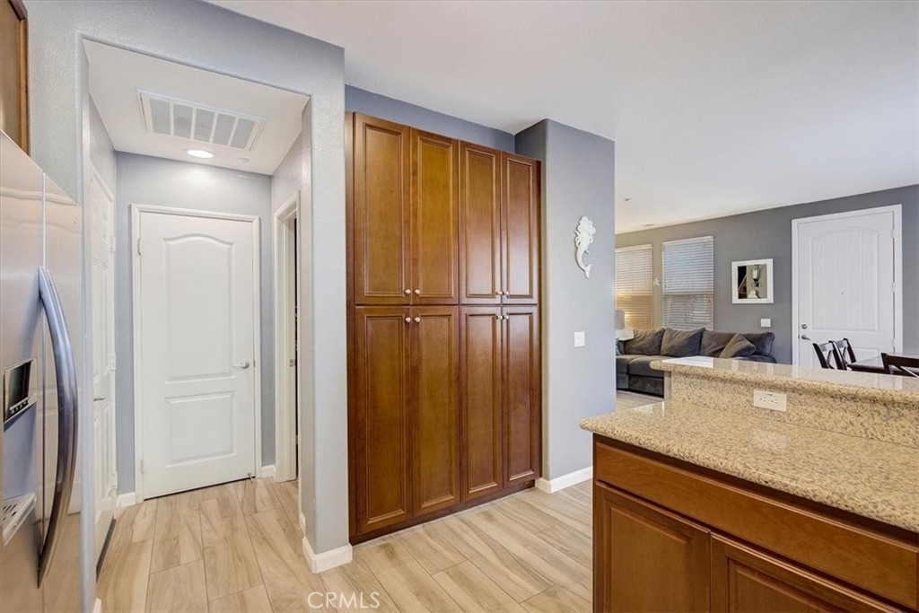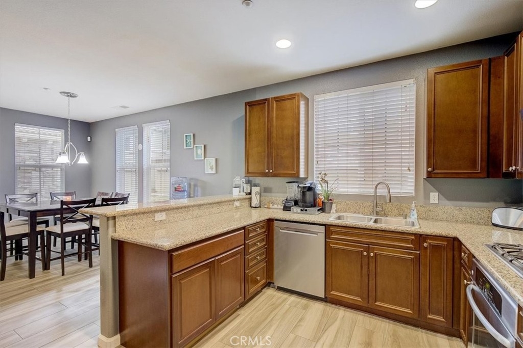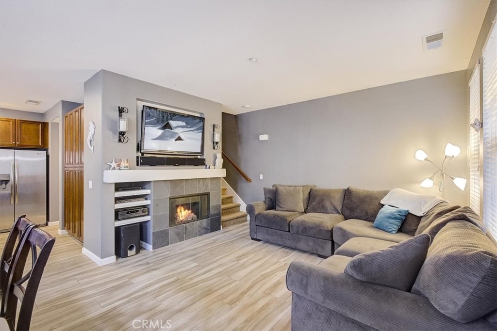 Gorgeous Condo in Brookfield Terrace! Immaculate 3 bedroom 2.5 bath end unit condo features new wood look porcelain flooring and neutral colors throughout along with 3-inch baseboards and an upgraded slate front fireplace. The kitchen has a breakfast counter, ample cabinet space, granite countertops, a new high-efficiency quiet dishwasher, a new faucet, and a pantry. There is also a half bathroom with tile flooring, and additional under stair storage space. All 3 bedrooms are on the 2nd floor, are generously sized, and have carpet flooring and ceiling fans. Enter the primary suite through double doors to a large room with crown molding and a private ensuite with a soaking tub, a separate walk-in shower, 2 vanities, and a walk-in closet. A full-size secondary bathroom, a laundry room with cabinet space, a built-in desk area, and a linen storage area complete the 2nd floor! This home also has heat reducing privacy tint on all of the windows, and there is also an attached 2-car garage with epoxy-coated flooring. Residents of this desirable community get to enjoy resort-like amenities including a swimming pool, spa, gym, clubhouse, picnic area, playground, and more! Conveniently located near shopping, dining, the 15 and the 215 freeways!