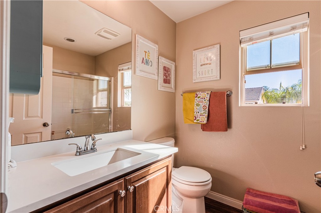 STUNNING | HIGHLY UPGRADED | SHOWS LIKE A MODEL HOME!!! Do not miss this opportunity to purchase a TURN KEY HOME WITH SOLAR!! Located in the award winning community of Canyon Hills. As you enter the home you will find modern, open concept family living. The kitchen is complete with SS appliances, granite counter tops, and charming cabinets. Downstairs features a complete 4th bedroom and full bathroom with custom tile shower. The flooring is engineered wood laminate. Upstairs is freshly carpeted and features 3 additional spacious bedrooms. The master bedroom is massive and tranquil with views of the rolling hills. The back yard is a beautiful entertaining play space with artificial turf, alumawood patio cover, and vinyl fencing. The entire home is energy efficient with double pane windows and insulated attic. CALLING ALL FIRST TIME HOME BUYERS!! Seller is willing to leave all appliances. The community boasts 3 community pools, sports park WITHIN WALKING DISTANCE, dog park, and MUCH MORE. Located between the 15 and 215 freeway, close to shopping and highly rated school. THIS HOME IS A MUST SEE!!!