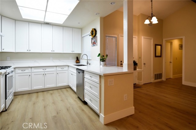 TURNKEY REMODELED Lakeside CONDO. Welcome to this beautifully remodeled 2 bed, 1 bath single-level condominium in the highly desirable Parkview Villas community. Offering 1,050 sqft of bright and open living space, this unit is ready for immediate occupancy. The interior boasts a spacious living room with a cozy fireplace and a high ceiling. Remodeled & Designed kitchen includes new cabinets, quartz countertops, faucet, sink, garbage disposal and dishwasher. Kitchen features a bay window. The bathroom has also been upgraded with a new vanity, faucet, sink, medicine cabinet, mirror, shower door and toilet. Easy to maintain laminate/vinyl flooring runs throughout the main living areas. Brand new ceiling fans in both bedrooms. Master bedroom with 2 closets and a sliding door leading to the backyard. Step outside to your private, fully enclosed backyard area with newly installed vinyl fence and artificial turf for clean and easy maintenance. Enjoy the convenience of an inside laundry room and the comfort of central A/C. Parking includes a 1-car attached garage plus one additional assigned parking space. Excellent location—walking distance to elementary school and park. Conveniently located next to supermarkets and easy access to I-15 commuters.