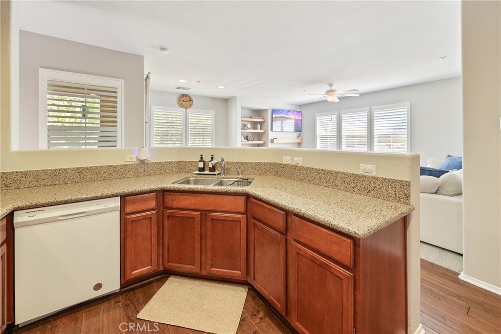 Turn-key FHA/VA Approved Lake Elsinore condo features 2 bedrooms and 2 bathrooms, an open floor plan with abundant natural light that highlights stunning views. The sizeable living area is perfect for entertaining and family time, while the separate dining area opens to a generous covered patio overlooking the community park and Lake Elsinore. Catch mesmerizing sunsets each evening. The kitchen offers extensive counter space and ample cabinet storage. Retreat to a large primary bedroom with an ensuite bath, dual sink vanity, and a spacious walk-in closet. This unit includes a one-car driveway and a direct-access garage with overhead storage racks. Prime location steps from the community park and near convenient parking options. Short stroll to additional street parking off Sunset. Easy access to I-15, Lake Elsinore Storm Stadium, shopping, dining, and entertainment A quick 20-minute drive to Temecula and its renowned wine country. Welcome Home!