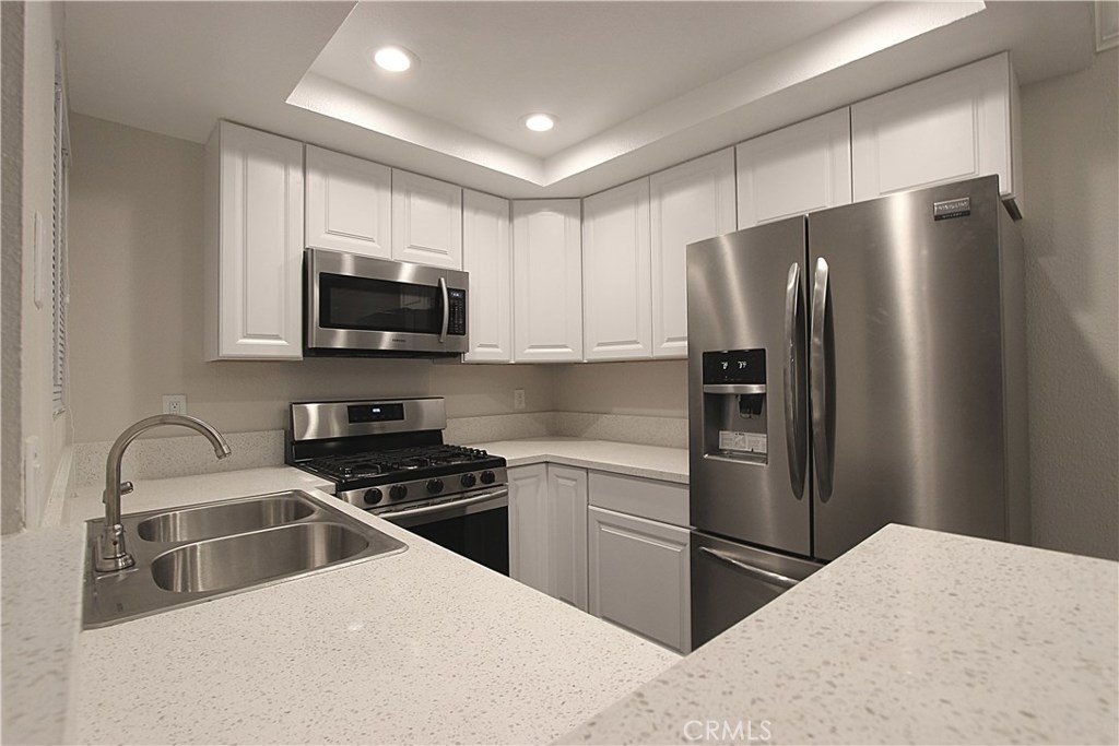 Welcome to Lido at Lakeshore in Lake Elsinore. This ground floor unit was renovated in late 2017 and has been rented to the same tenant since. The property received a contemporary renovation to include grey laminate wood floors throughout, with grey tile in the kitchen and bathrooms. The kitchen was redesigned to maximize space and offers bright white cabinetry with white quartz countertops complimented by stainless steel appliances, including refrigerator. The spacious family room opens to a large private covered patio with laundry closet. All through the property is tall baseboards and crown molding with recessed lighting in all the right places, ceiling fans in each of the bedrooms and contemporary light fixtures in the dining room along with each of the two full bathrooms. Lido offers two gated entrances, along with private off street parking, and a community pool and spa. This unit also includes an oversized detached one car garage. This is a great value for a move-in ready condo!