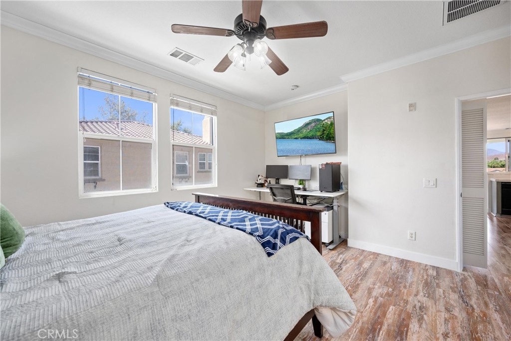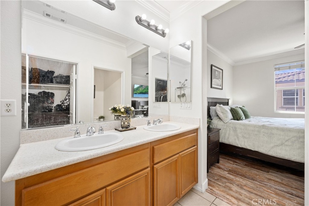 VA-LOAN ELIGIBLE CONDO!! 2-CAR ATTACHED GARAGE | PANORAMIC MOUNTAIN VIEWS | UPGRADED | END UNIT | MOVE-IN READY | OPEN CONCEPT | Welcome to this beautiful condo in the desirable Belcaro Lake Point community, where comfort, style, and convenience come together. Step inside and be greeted by abundant natural light and panoramic views that create a warm and inviting atmosphere throughout. The living room features a cozy gas fireplace and flows seamlessly into the dining area, ideal for entertaining and everyday living. The kitchen is a chef’s delight with breakfast bar seating, a double sink, pantry, and freshly painted ample cabinetry that gives it a bright, updated look. The spacious primary bedroom offers plenty of room for a seating area and includes a generous walk-in closet. The ensuite bathroom is designed for both function and relaxation, featuring dual sink countertops, abundant storage, a dual showerhead, and a privacy door. A well-sized second bedroom provides flexibility for guests or family, while the second full bathroom includes a tub and shower combination. The bonus room is the perfect space for a private office, gym, or creative studio, adding versatility to the floorplan. For added convenience, the home includes an in-unit laundry room complete with washer and dryer. Step outside to the large covered private patio, the perfect place to relax and take in breathtaking sunsets. UPGRADES: Crown Molding, Wide Floor Molding, Updated Luxury Flooring, LED lights, and fresh paint throughout. AMENITIES: Enjoy a quick walk to resort-style amenities including a sparkling pool and spa with shower facilities, a playground, BBQ, and beautifully maintained grounds. LOCATION: Easy access to Storm Stadium, the Lake, shopping outlets, and scenic biking trails. COMMUTE: Quick access to 15 Expressway, 91 & 71 Freeways, & 241 Toll Road. Close to 15 Frwy, Ortega highway, and nearby public transit. This home combines modern comfort with an unbeatable location, making it a wonderful opportunity for those seeking both tranquility and convenience.